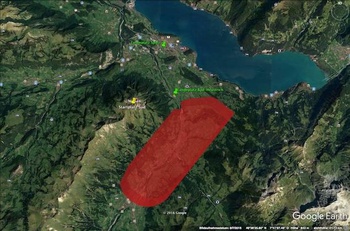 Achtung: Bei guten Tagen sind Talwind von 25-30 Km/h oder noch stärker normal. Bei labilen Bisenlage ist der Talwind noch stärker. Starker Talwind kommt hier in Frutien in der Regel eher von Ost. Also nicht gerade ins Tal rein sonder eher von schräg rechts, wenn Du talauswärts schaust. Fliege darum beim Queranflug keinesfalls über den gelb schraffieren Bereich. Bitte Landetaxe von 2.— ins weisse Kässeli rechts neben dem Hangareingang zahlen oder mit Twint direkt am Landeplatz.